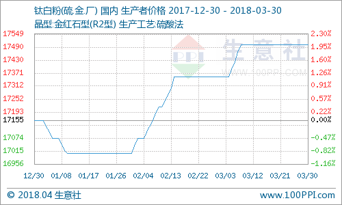 生意社鈦白粉分析師楊遜認為:3月龍企價格守恒,少數(shù)持貨商“心慌”低價出貨,但掩飾不掉多數(shù)的盼漲情緒,4月開春回暖,后市鈦白粉的價格硬度或有所加強,短期看,實單操作一單一議。