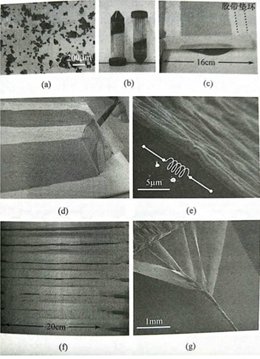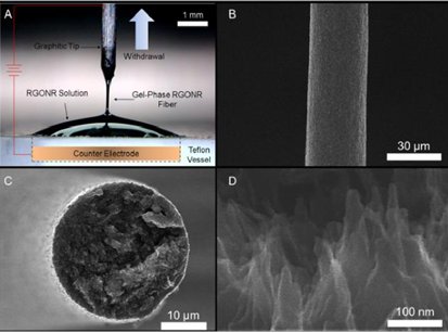 (a)提拉過程光學照片,(b)利用電泳自組裝法制得的實心石墨烯纖維,(c)纖維斷裂截面,(d)截面?zhèn)纫晥D