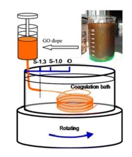濕法紡絲是利用機械裝置,將凝膠狀氧化石墨烯水溶液從微孔中擠出成絲,并經過溶液浸泡(凝固。┏尚停俳涍^高溫或者化學還原制得石墨烯纖維。