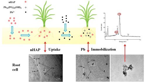 為此,固體所環(huán)境與能源納米材料中心研究團隊研究了水培條件下nHAP在水稻根細胞中的傳輸與分布,并探討了nHAP降低Pb在水稻體內(nèi)的毒性和遷移性方面的機制。研究結(jié)果表明,nHAP (20±5 nm)進入水稻根部后可以作為阻擋層捕獲Pb2+,抑制了Pb2+從根部向地上部的轉(zhuǎn)運,進而降低Pb2+的生物毒害。其固定機制主要體現(xiàn)在通過水稻根細胞中存在的nHAP與Pb2+結(jié)合,并將Pb2+轉(zhuǎn)化為根細胞中的Pb沉積物,一方面減少Pb2+對根部正常生長的干擾;另一方面減少Pb2+向地上部分的遷移,最終達到對Pb2+的固定作用。相關(guān)結(jié)果不僅為環(huán)境納米材料在植物根細胞中固定Pb2+的作用機制提供了理論依據(jù),同時為利用納米技術(shù)減少Pb在水稻體內(nèi)吸收和轉(zhuǎn)移提供了技術(shù)支撐。這項研究對于保證區(qū)域農(nóng)產(chǎn)品安全、提高稻米質(zhì)量、保障人體健康等都具有重要意義。