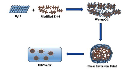 外加乳化法是在高速分散下將環(huán)氧樹脂與乳化劑均勻混合,之后緩慢地向體系中加入水,使得整個(gè)體系逐漸由油包水型相反轉(zhuǎn)成水包油型,進(jìn)而形成穩(wěn)定的水性環(huán)氧乳液。