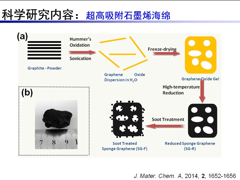 東南大學(xué)畢恒昌博士(代孫立濤教授)提出一種制備三維石墨烯的方法。將石墨烯附著在海綿上,然后除掉海綿,就可以得到三維石墨烯材料,因?yàn)楹>d是多孔材料,所以得到的三維石墨烯材料也是多孔材料,具有較強(qiáng)的吸附性。