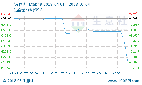 5月4日,國(guó)內(nèi)金屬鈷市場(chǎng)均價(jià)617500.00元/噸,單日鈷價(jià)下降2.3萬元/噸,跌幅3.64%;國(guó)內(nèi)主要廠家出廠價(jià)暴跌,單日出廠價(jià)均價(jià)下跌4萬元/噸,跌幅6.06%。鈷價(jià)在持續(xù)了一年多的暴漲之后,在4月份開始震蕩下跌,并在5月初鈷價(jià)出現(xiàn)暴跌。