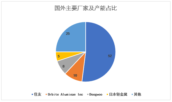 國外高純氧化鋁產(chǎn)能約20000噸,其中日本住友化學(xué)的產(chǎn)能共4800噸,占國外總產(chǎn)能的24%。在韓國工廠的產(chǎn)能1600噸,主要用于鋰電池的耐熱隔膜和電極涂層的生產(chǎn)。Orbite通過獨(dú)特工藝可生產(chǎn)出純度為5N-6N,產(chǎn)能為2000噸。