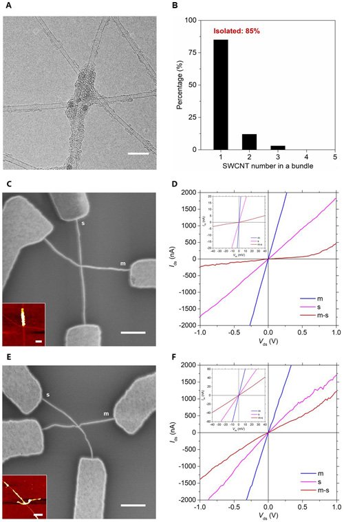 圖1. 單根分散、具有碳焊結構的SWCNT網(wǎng)絡。(A)典型TEM照片;(B)單根SWCNT的百分含量統(tǒng)計;(C-D)無碳焊結構的金屬性-半導體性SWCNT的I-V傳輸特性;(E-F)有碳焊結構的金屬性-半導體性SWCNT的I-V傳輸特性。