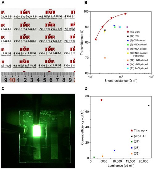 圖2. SWCNT 柔性透明導電薄膜和SWNCT 有機發(fā)光二極管。(A-B)SWCNT 柔性透明導電薄膜的光學照片及其透明導電性能對比;(C-D)SWCNT 有機發(fā)光二極管原型器件的光學照片及其光電性能對比。