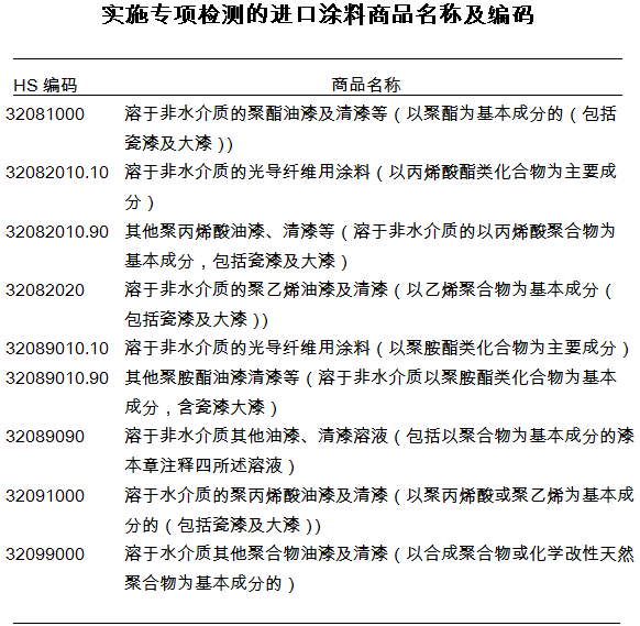 公告提出,《進口涂料備案書》在有效期內的進口涂料備案申請人應及時向所在地海關提出申請,于2018年7月1日前完成《進口涂料備案書》換發(fā)。據公告,海關將對溶于非水介質的聚酯油漆及清漆、溶于非水介質的光導纖維用涂料等9項進口涂料產品實施專項檢測。本公告內容自發(fā)布之日起施行。