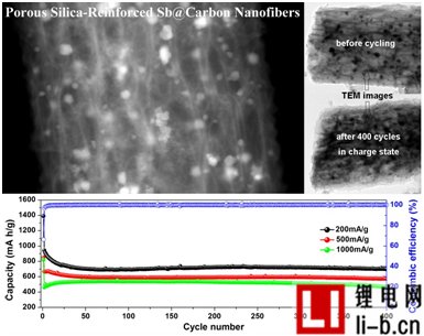 基于二氧化硅(SiO2)作為填料可以提高復(fù)合材料機(jī)械性能這一現(xiàn)象,西安交通大學(xué)電氣學(xué)院牛春明千人團(tuán)隊(duì)王紅康老師課題組設(shè)計(jì)并成功制備了一種SiO2增強(qiáng)的多孔Sb/C纖維復(fù)合材料。利用靜電紡絲法將硅源(硅酸乙酯)、銻源(三氯化銻)和碳源(聚乙烯吡咯烷酮)制備成纖維結(jié)構(gòu),再通過(guò)熱處理一步形成了多孔碳纖維包覆SiO2和Sb納米顆粒的獨(dú)特結(jié)構(gòu)。SiO2的引入大大增強(qiáng)了纖維的整體結(jié)構(gòu)穩(wěn)定性。作為鋰離子電池負(fù)極材料,所得SiO2/Sb/C多孔纖維電極在半電池和全電池測(cè)試中均顯示了優(yōu)異的電化學(xué)性能。碳纖維不但提高了電極材料的導(dǎo)電性,而且其多孔結(jié)構(gòu)有效消納了SiO2和Sb在嵌/脫鋰過(guò)程中體積變化。通過(guò)原位和非原位電鏡表征,進(jìn)一步揭示了該材料在嵌/脫鋰過(guò)程中的結(jié)構(gòu)穩(wěn)定性。該工作提出的電極材料結(jié)構(gòu)增強(qiáng)思路,即利用SiO2增強(qiáng)效應(yīng)(Silica-Reinforcement Effect)同步實(shí)現(xiàn)了電極結(jié)構(gòu)穩(wěn)定性和儲(chǔ)鋰性能的雙提升,且該方法具有通用性( Materials Today Energy 2016, 1–2, 24-32;Nanoscale 2016, 8, 7595-7603)。