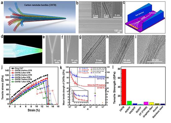 a、碳納米管管束示意圖;b、所用到的超長碳納米管的結(jié)構(gòu);c、利用氣流聚焦法制備超長碳納米管管束的示意圖;d、超長碳納米管在聚焦氣流下發(fā)生合并的模擬圖;e-i、所制備的具有確定組成的超長碳納米管管束;j-k、所制備的碳納米管管束的力學性質(zhì);l、超長碳納米管管束與其他材料拉伸強度對比圖