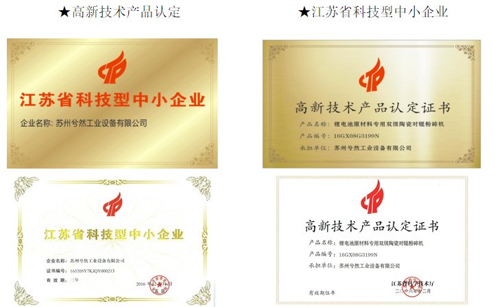 蘇州兮然工業(yè)設備有限公司坐落于—蘇州工業(yè)園區(qū),是一家專業(yè)生產(chǎn)陶瓷對輥破碎機、超微石盤磨(經(jīng)過對輥機粉碎粗磨出來的物料可達:1-3mm,再通過超微石盤磨細磨出來的物料可達:7um,完全達到Li電行業(yè)的要求)以及錐形真空干燥機(主要用于鋰電池正極材料一燒后、二燒前水洗工藝的預干燥)等設備的專業(yè)廠家。產(chǎn)品銷往全國各地,產(chǎn)品質量與性能均達到國內先進水平,深受用戶的歡迎和信賴。我司還配有專門實驗室,歡迎廣大客戶來我司進行實驗。