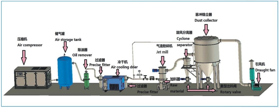 流化床氣流粉碎機(jī)是一種用高速氣流來實現(xiàn)干式物料超細(xì)粉碎的設(shè)備。壓縮氣體通過噴嘴高速在粉碎區(qū)域噴射,帶動粉體原料高速運(yùn)動,并在四個噴嘴交匯處高速沖擊,達(dá)到自身碰粉碎,被粉碎的物料隨負(fù)壓上升到分級區(qū)域,粒子受到分級輪高速旋轉(zhuǎn)的離心力以及風(fēng)機(jī)負(fù)壓向心力的同時作用,顆粒越大離心力越大,顆粒小即達(dá)到要求的顆粒通過分級輪葉片間隙入旋風(fēng)分離器和捕集器收集。被離心力甩出的大顆粒,返回粉碎區(qū)繼續(xù)粉碎。