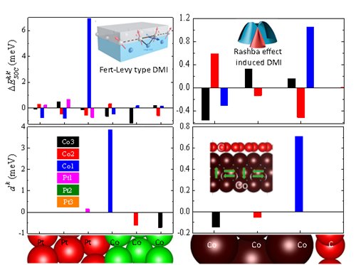 中國科學(xué)院寧波材料技術(shù)與工程研究所研究員楊洪新自2012年起就開展DMI方面的工作,曾與Mairbek Chshiev教授、Andrea Thiaville教授以及諾貝爾獎(jiǎng)得主Albert Fert等合作發(fā)展了基于第一性原理計(jì)算界面DMI的方法,成功地從第一性原理角度揭示了鐵磁金屬和重金屬界面Fert-Levy型DMI的物理圖象(如圖2左)[HY et et al. Phys. Rev. Lett. 115, 267210 (2015); O. Boulle, J. Vogel, HY et al. Nature Nanotech. 11, 449 (2016)],鐵磁金屬與重金屬界面也是當(dāng)前拓?fù)浯沤Y(jié)構(gòu)研究最多的體系,然而,F(xiàn)ert-Levy機(jī)制要求非磁襯底提供強(qiáng)SOC才能產(chǎn)生較大DMI(如圖2左上),從而導(dǎo)致襯底材料的選擇要多從5d等重金屬材料中做出,而重金屬的存在,一般會(huì)影響存儲器件的讀寫效率,并與當(dāng)前工業(yè)界普遍使用的磁隧道結(jié)存儲結(jié)構(gòu)不兼容,使制造工藝復(fù)雜化,因而如何突破重金屬的限制,即突破Fert-Levy機(jī)制實(shí)現(xiàn)較大DMI,成為該領(lǐng)域的一大難題。