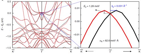 為解決這一問題,楊洪新及其合作者對鐵磁金屬和石墨烯界面進(jìn)行了深入研究,其結(jié)構(gòu)如圖1所示,發(fā)現(xiàn)在單層Co與石墨烯界面可以誘導(dǎo)高達(dá)1.14meV的DMI,而三層Co與石墨烯界面則可以誘導(dǎo)強(qiáng)度為0.49meV的DMI,其強(qiáng)度完全可以與部分鐵磁金屬/重金屬界面DMI相比,更為有意思的是,該體系的物理機(jī)制完全不同于Fert-Levy型DMI,從圖2可以看到,在Co/Pt結(jié)構(gòu)中,DMI在界面鐵磁層Co層最大,而其能量來源,即SOC能量并非來自Co層,而是來自界面的貴金屬Pt層;在graphene/Co中,DMI和SOC能量則都在Co層內(nèi),該差別的物理本源是因?yàn)樵趃raphene/Co的界面DMI是Rashba效應(yīng)誘導(dǎo)的DMI(如圖2右),而Co/Pt界面為Fert-Levy型。為驗(yàn)證Rashba效應(yīng)誘導(dǎo)的DMI,楊洪新與其合作者進(jìn)一步通過第一性原理計(jì)算了不同磁方向上的能帶變化進(jìn)而計(jì)算出Rashba系數(shù),從Rashba系數(shù)計(jì)算出DMI大小為0.18meV,與第一性原理計(jì)算所得0.49meV在同一量級(如圖3)[HY et al. Nature Materials (2018) doi:10.1038/s41563-018-0079-4]。