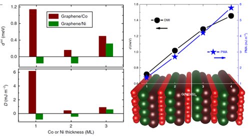 圖5 Co(Ni)/graphene界面DMI隨鐵磁層厚度變化(左),graphene/Co/Ni/graphene多層膜中DMI及PMA隨異質(zhì)結(jié)數(shù)變化(右)