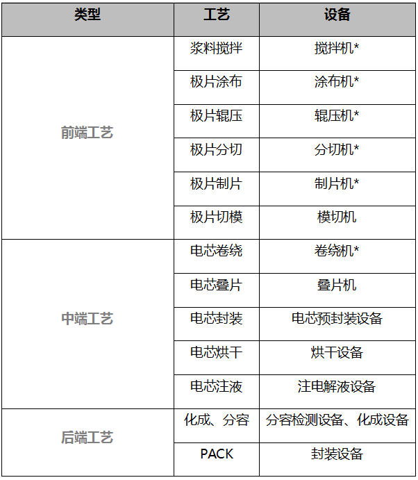 按鋰電池的生產工藝分類,可以將鋰電池設備分為前端設備、中端設備和后端設備。