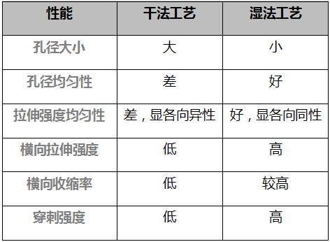 鋰離子電池隔膜制備方法主要有濕法和干法。干法和濕法隔膜性能比較如下: