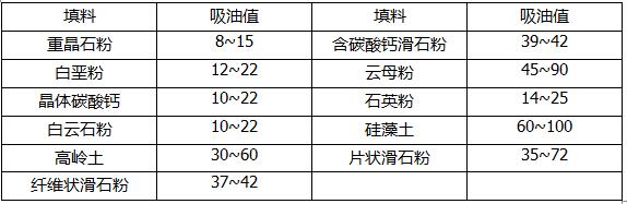 涂料常用非金屬礦物填料的吸油值(g/100g)