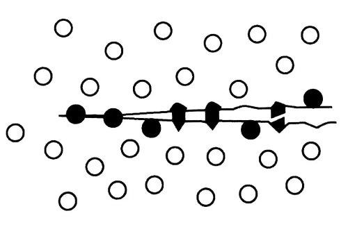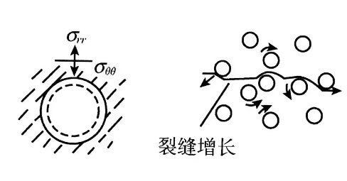 當異質(zhì)相顆粒足夠強時,基體中擴展的裂紋在遇到異質(zhì)相顆粒時將不能輕易穿過該顆粒,從而可能在該顆粒之間發(fā)生彎曲。此時,要使裂紋擺脫顆粒的釘扎繼續(xù)向前擴展,必須進一步提高裂紋擴展驅(qū)動力,從而起到增韌作用(如圖)。