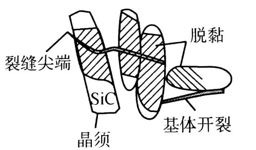 在基體中摻入高強度、高韌性的纖維或高韌性的金屬微粒,可使宏觀裂紋在穿過纖維或微粒時受阻,從而提高了材料的強度和韌性。當金屬顆粒作為異質(zhì)相時,金屬顆粒在裂紋擴展應力作用下的塑性變過程可以消耗大量能量,從而提高材料的斷裂韌性。當異質(zhì)相為鐵電或壓電相時,電疇在裂紋尖端應力的作用下轉(zhuǎn)向或產(chǎn)生壓電效應時,也會消耗一定量的機械能,同樣可以起到增韌作用。另外晶須的脫黏、拔出作用也是晶須增強的機理(如圖)。