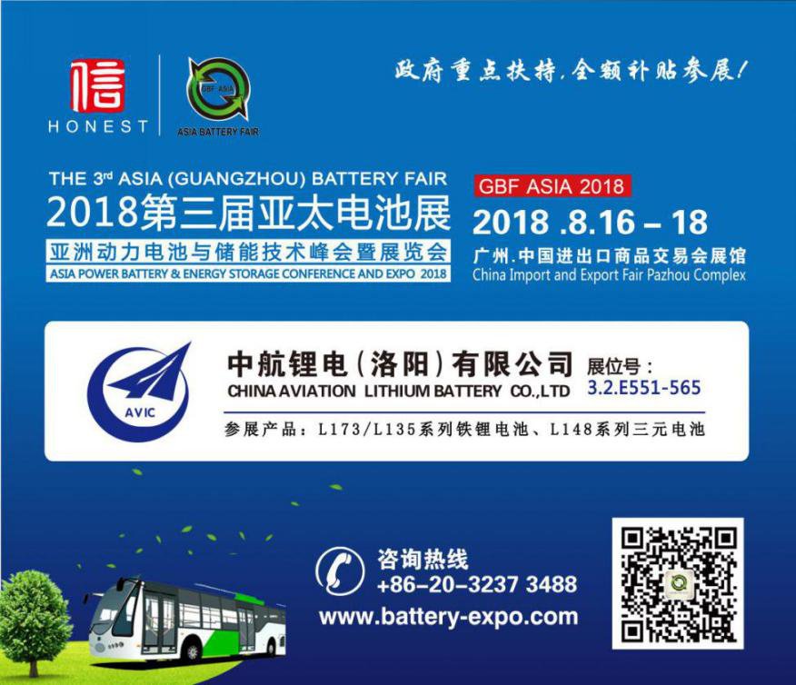 中國粉體網(wǎng)訊 第三屆亞太電池展、亞洲動(dòng)力電池與儲(chǔ)能技術(shù)峰會(huì)(GBF ASIA 2018)于8月16日-18日在廣州琶洲·廣交會(huì)展館A區(qū)舉辦,中航鋰電(洛陽)有限公司(下稱“中航鋰電”)攜公司產(chǎn)品以支持單位身份隆重亮相。