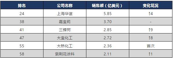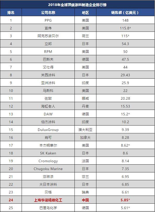 根據(jù)美國《涂料世界》描述2018年共有六家公司被從名單中刪除。由于收購,Dunn Edwards,Helios和Valspar; Boero(收入不到100美元)和Mido和Pachin(由于埃及貨幣貶值)。今年新增加的兩家新公司均來自德國。