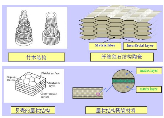 中國粉體網(wǎng)訊 層狀復(fù)合陶瓷的設(shè)計思路是在脆性陶瓷中加入軟質(zhì)的耐高溫材料制成層狀復(fù)合陶瓷,雖然其組分簡單,但精細(xì)的復(fù)合結(jié)構(gòu)保證了材料優(yōu)良的力學(xué)性能。層狀復(fù)合是一種仿生設(shè)計,這些仿生材料的特點(diǎn)不僅可以從組分設(shè)計上改善陶瓷韌性,還可以從宏觀結(jié)構(gòu)來設(shè)計新型材料,形成不同尺度多級增韌機(jī)制協(xié)同作用,是陶瓷補(bǔ)強(qiáng)增韌的新思路。目前,常用的仿生結(jié)構(gòu)有竹木結(jié)構(gòu)、貝殼結(jié)構(gòu)等。