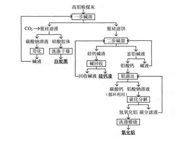 高鋁粉煤灰兩步堿溶法提取氧化鋁工藝流程圖