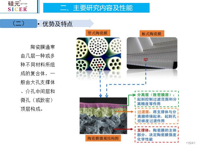 樊震坤教授在報告中提及,硅元陶瓷膜產(chǎn)品技術(shù)指標(biāo)達(dá)到國際先進(jìn)水平,形成了1條年產(chǎn)200000平方米高性能陶瓷膜產(chǎn)品的示范線。
