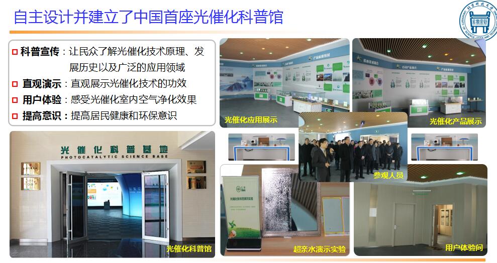 曹文斌教授團(tuán)隊研發(fā)的光催化噴劑實現(xiàn)了產(chǎn)業(yè)化,與某企業(yè)合作成立了光催化噴劑生產(chǎn)企業(yè),年產(chǎn)能達(dá)到500噸,且通過了相關(guān)的產(chǎn)品質(zhì)量認(rèn)證,并被評為國家級高新技術(shù)企業(yè)。另外還自主設(shè)計并建立了中國首座光催化科普館。