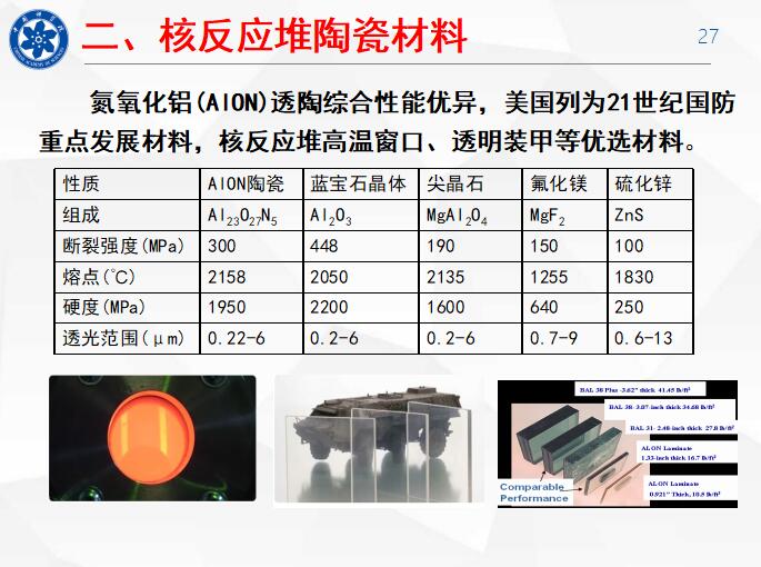陶瓷材料如SiC陶瓷具有中子特性好、高溫強度大、熱導(dǎo)率大、耐化學(xué)腐蝕等優(yōu)良特性,SiC基復(fù)合材料若能進(jìn)一步優(yōu)化性能,具有比金屬材料更好的耐高溫、耐腐蝕等綜合服役性能,將會成為新型核反應(yīng)堆的首選材料。中國科學(xué)院福建物質(zhì)結(jié)構(gòu)研究所周有福研究員在報告中提出,引入MAX相低溫制備高致密高導(dǎo)熱SiC-TiC復(fù)合陶瓷;利用電泳沉積-浸漬熱解法制備高性能SiCf/SiC復(fù)合材料;采用固相反應(yīng)法合成碳化鈹粉體,制備了磁性碳化鈹小球;直接氮化法合成了高質(zhì)量AlON陶瓷粉體,無壓燒制了直線透過率>80 %高質(zhì)量AlON陶瓷片等。