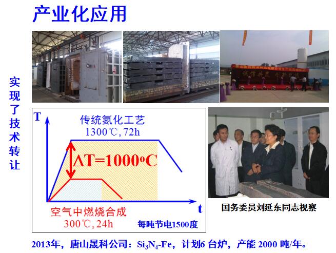 氮化硅陶瓷的市場需求總量巨大,但國內(nèi)氮化硅粉體與用戶要求的差距很大,制約其規(guī);瘧(yīng)用的關(guān)鍵因素包括:粉體產(chǎn)品的性能低;產(chǎn)量普遍較低;生產(chǎn)工藝落后。中國科學(xué)院理化技術(shù)研究所李江濤研究員試圖利用燃燒合成這一典型的低成本制備技術(shù)來滿足市場對氮化硅粉體的巨大需求。李研究員團(tuán)隊在廊坊建立了中試基地并積累了相關(guān)的工程化經(jīng)驗。其團(tuán)隊在裝備與工藝上的創(chuàng)新使氮化硅陶瓷在合成溫度、制備周期及能耗方面都具備了明顯的優(yōu)勢,為氮化物陶瓷的產(chǎn)業(yè)化鋪平了道路。目前已經(jīng)成功的產(chǎn)業(yè)化案例包括為某公司建立的年產(chǎn)萬噸燃燒合成VN-Fe生產(chǎn)線,以及為多晶硅鑄錠脫模劑粉體的國內(nèi)一家龍頭企業(yè)提供的光伏級Si3N4制備技術(shù)。