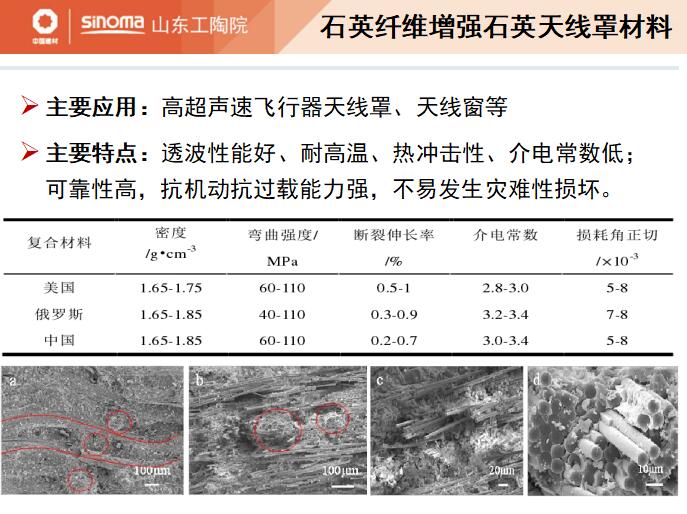 石英材料具有低導(dǎo)熱、低膨脹、低介電常數(shù)、低損耗角損耗及良好的高溫性能穩(wěn)定性等優(yōu)點,在防熱、隔熱、透波、承載等領(lǐng)域廣泛應(yīng)用。山東工業(yè)陶瓷設(shè)計研究院新材料事業(yè)部副總經(jīng)理王洪升在報告中提到,熔融石英陶瓷是應(yīng)用于超音速導(dǎo)彈天線罩的主要材料,“殲十、梟龍”等戰(zhàn)斗機所攜帶的導(dǎo)彈均選用此材料;國內(nèi)研制的石英纖維織物增強石英基復(fù)合材料已經(jīng)獲得型號應(yīng)用,主要應(yīng)用于高超聲速飛行器天線罩、天線窗等;碳纖維增強石英材料為超高聲速武器用導(dǎo)彈提供耐高溫、低導(dǎo)熱以及低膨脹連接環(huán);輕質(zhì)、高效隔熱的陶瓷剛性隔熱瓦材料是高超聲速飛行器研制過程的關(guān)鍵部件。