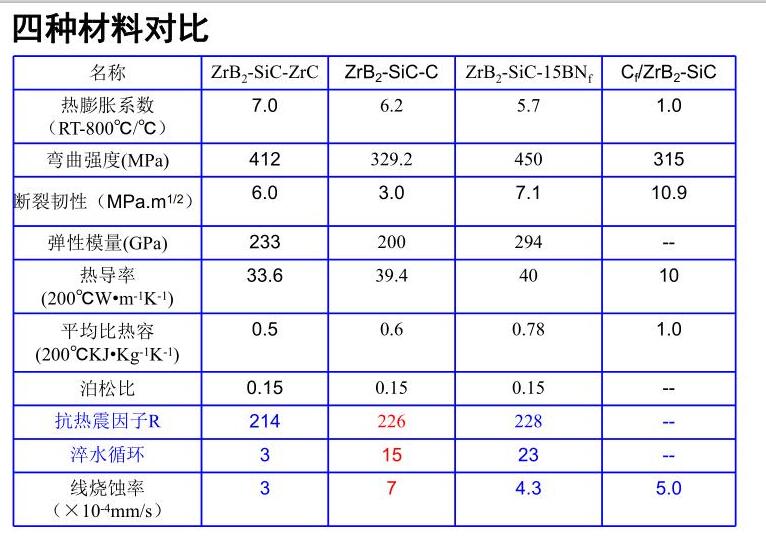 高超音速飛行器長時間在大氣層內(nèi)飛行,要求防熱部件能長時間在氧化氣氛中經(jīng)受2000℃以上的高溫。同時,又要求不能發(fā)生燒蝕。一般的難熔金屬材料、燒蝕材料、C/C復(fù)合材料以及陶瓷材料等均不能滿足使用要求。山東工業(yè)陶瓷設(shè)計研究院周長靈教授在報告中首先介紹了超高溫陶瓷材料在美國、意大利及中國的研究現(xiàn)狀,然后依次介紹了四種超高溫陶瓷材料(即ZrB2-SiC-ZrC三元陶瓷、ZrB2-SiC-C超高溫復(fù)相陶瓷、ZrB2 -SiC-BNf復(fù)相陶瓷及C f/ZrB2-SiC復(fù)合材料)的制備以及它們耐高溫、抗燒蝕、抗熱震性能的機理。