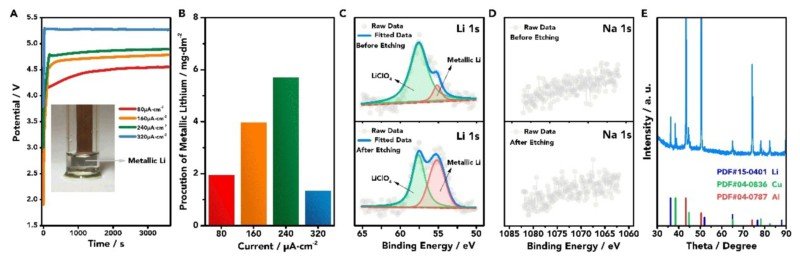 圖3:(A)在80、160、240和320 μA·cm-2電流密度下的電位-時間曲線(插圖為在80 μA·cm-2電流密度下電解1 h的電極照片);(B)每平方厘米銅片上的金屬鋰產量;(C)沉積產物在氬離子刻蝕前后Li的XPS表征圖;(D)陰極沉積產物在氬離子刻蝕前后Li和Na的XPS表征圖;(E)沉積產物的XRD表征圖(Al峰來自于氣氛保護裝置的樣品臺)