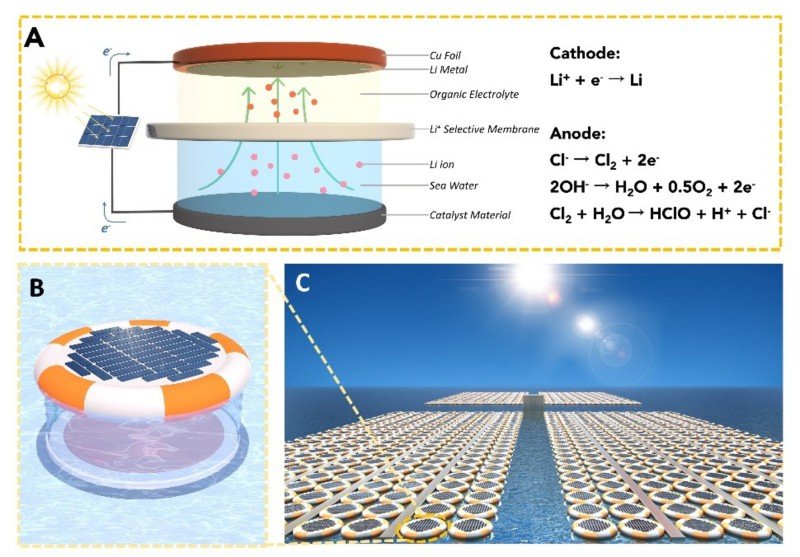 圖2:(A)太陽能驅動的電解法海水提鋰裝置原理示意圖;(B)裝置單體示意圖,自上而下分別為太陽能板、有機電解液陰極區(qū)、陶瓷選擇性膜、海水陽極區(qū),整個裝置可以利用橡皮圈浮于海面;(C)海上大量裝置排列的假想圖。