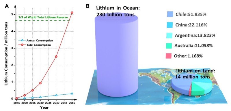 圖1:(A)鋰資源在2015~2050年間的預期年消耗量和總消耗量曲線;(B)海洋和陸地中鋰資源儲量對比圖,陸地上鋰資源分布不均,主要分布在智利、中國、阿根廷和澳大利亞。