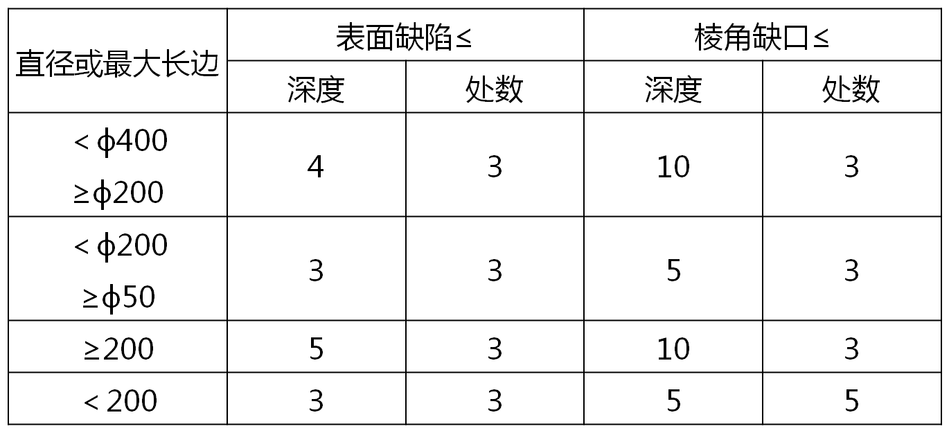 高純石墨毛坯不應(yīng)有氧化、裂紋和外表雜質(zhì)。毛坯表面缺陷和棱角缺口不得超過下表的規(guī)定。