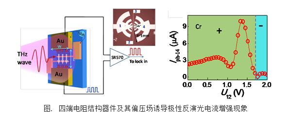 在國(guó)家重點(diǎn)研發(fā)計(jì)劃項(xiàng)目支持下,中國(guó)科學(xué)院上海技術(shù)物理研究所、紅外物理國(guó)家重點(diǎn)實(shí)驗(yàn)室陸衛(wèi)、陳效雙、王林、陳剛及合作者們避開(kāi)了傳統(tǒng)器件的設(shè)計(jì)思路,采用四端電阻結(jié)構(gòu)實(shí)現(xiàn)對(duì)不同器件的電極互連(如圖所示),研究發(fā)現(xiàn)了通過(guò)電極之間的互連產(chǎn)生類(lèi)似于三極管的器件開(kāi)關(guān)性能。同時(shí),研究人員通過(guò)電極之間的偏壓效應(yīng)產(chǎn)生石墨烯溝道的非對(duì)稱(chēng)光電流,在偏壓作用下器件光電流呈現(xiàn)出線(xiàn)性上升的趨勢(shì),產(chǎn)生光電流增益,對(duì)應(yīng)器件響應(yīng)出現(xiàn)數(shù)量級(jí)的提高。此外,研究表明石墨烯和金屬接觸位置的局域場(chǎng)可以驅(qū)動(dòng)非平衡載流子,誘導(dǎo)石墨烯溝道載流子分布的變化,在偏壓場(chǎng)作用下器件產(chǎn)生光電導(dǎo)效應(yīng),器件響應(yīng)可以達(dá)到280V/W,為當(dāng)前國(guó)際報(bào)道的最高值。該項(xiàng)研究工作將為實(shí)現(xiàn)便攜式成像系統(tǒng)、人體醫(yī)學(xué)太赫茲表征設(shè)備的核心器件提供嶄新的途徑,該項(xiàng)研究工作于2018年4月18日發(fā)表在NPG Asia Materials雜志上。