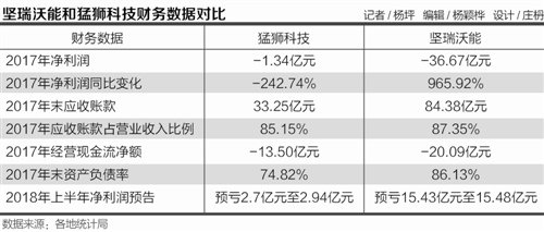 根據(jù)公開資料顯示,2017年猛獅科技和堅瑞沃能凈利潤分別虧損1.34億元和36.67億元,同比下降242.74%和965.92%;公司應(yīng)收賬款分別為33.25億元和84.38億元,占營業(yè)收入比例分別為85.15%和87.35%;經(jīng)營現(xiàn)金流凈額分別為-13.50億元和-20.09億元;資產(chǎn)負(fù)債率分別升至74.82%和86.13%。