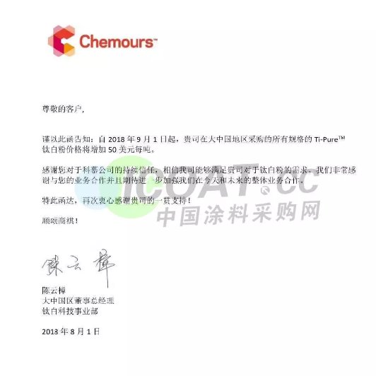 謹以此函告知:自2018年9月1日起,貴司在大中國地區(qū)采購的所有規(guī)格的Ti-Pure™鈦白粉價格將增加50美元每噸。