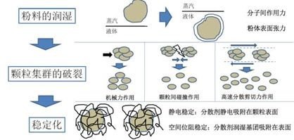 固體粉料在液體中的分散過程可以分為三個(gè)階段,如圖所示。干法制漿工藝與濕法工藝的不同之處是第二階段物料之間、設(shè)備與物料之間存在較大的內(nèi)摩擦力,在各方面作用力下,物料可以達(dá)到很好的分散狀態(tài)。漿料分散程度高,對(duì)極片的質(zhì)量是有利的。同時(shí)干法混料工藝顯著縮短了攪拌工藝時(shí)間。