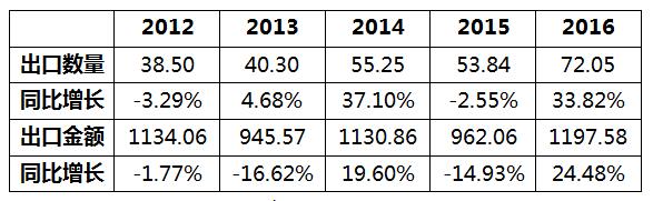 2012—2016年鈦白粉出口數(shù)量和出口額及增速統(tǒng)計