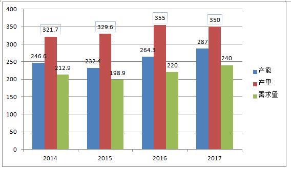 2014-2017年我國鈦白粉市場行情(單位:萬t)