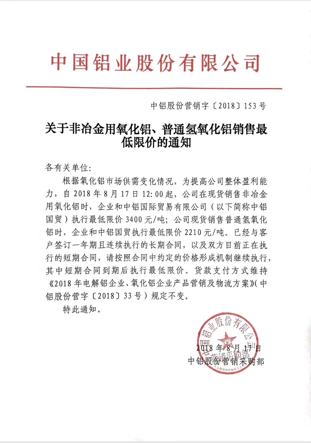 中國粉體網(wǎng)訊 近日,中國鋁業(yè)股份有限公司發(fā)布《關于非冶金用氧化鋁、普通氫氧化鋁銷售最低限價的通知》通知中表明,根據(jù)氧化鋁市場供需變化情況以及提高公司整體盈利能力,自2018年8月17日12:00起,公司在現(xiàn)貨銷售非冶金用氧化鋁時,企業(yè)和中鋁國際貿(mào)易有限公司(以下簡稱中鋁國貿(mào))執(zhí)行最低限價3400元/噸;其具體通知如下: