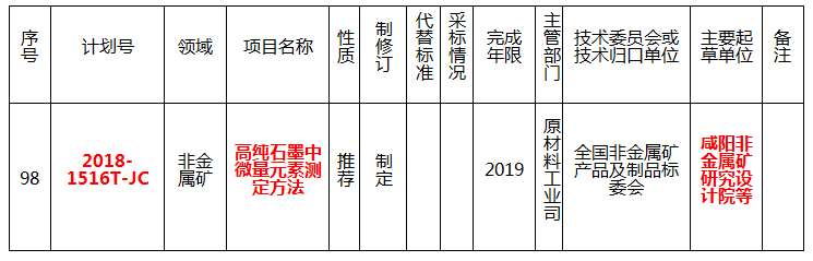 2018年第三批共安排項(xiàng)目計(jì)劃449項(xiàng)。其中制定354項(xiàng),修訂95項(xiàng);產(chǎn)品類(lèi)標(biāo)準(zhǔn)399項(xiàng),工程建設(shè)標(biāo)準(zhǔn)11項(xiàng),節(jié)能與綜合利用標(biāo)準(zhǔn)37項(xiàng),標(biāo)準(zhǔn)樣品2項(xiàng)。外文版項(xiàng)目計(jì)劃24項(xiàng),其中翻譯現(xiàn)有行業(yè)標(biāo)準(zhǔn)的17項(xiàng)、與行業(yè)標(biāo)準(zhǔn)制修訂計(jì)劃同步研制外文版的7項(xiàng)。涉及化工行業(yè)、石化行業(yè)、建材行業(yè)、鋼鐵行業(yè)、船舶行業(yè)、輕工行業(yè)、紡織行業(yè)、包裝行業(yè)、電子行業(yè)、通信行業(yè)、制藥裝備行業(yè)。其中,建材行業(yè)計(jì)劃制定高純石墨中微量元素測(cè)定方法相關(guān)標(biāo)準(zhǔn)。