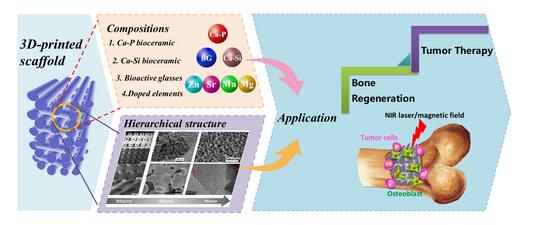 在此基礎(chǔ)上,研究團(tuán)隊(duì)進(jìn)一步將生物陶瓷通過(guò)3D打印方式制備成仿生人體結(jié)構(gòu)的多孔復(fù)雜結(jié)構(gòu),并將其組織修復(fù)拓展到腫瘤治療。由于交通事故、衰老、骨腫瘤等引起的骨組織缺損給人類(lèi)健康和生活質(zhì)量帶來(lái)了巨大的危害。因此,許多研究關(guān)注于骨組織缺損修復(fù)材料的制備及設(shè)計(jì)。3D打印技術(shù)以其快速、精確、可控、個(gè)性化的制作工藝在骨組織工程中得到廣泛應(yīng)用,制備的三維支架提供了有利于細(xì)胞粘附和增殖的三維環(huán)境。傳統(tǒng)的3D打印生物陶瓷支架主要用于骨組織再生,而此篇綜述著重介紹了具有腫瘤治療和骨再生功能的3D打印生物陶瓷支架的最新進(jìn)展。這種功能性生物陶瓷支架在修復(fù)手術(shù)引起的骨缺損和殺滅可能殘留的腫瘤細(xì)胞方面具有巨大的潛力,可達(dá)到骨腫瘤治療的目的。該綜述闡述了3D打印生物陶瓷支架的組成和結(jié)構(gòu)(宏觀、微觀和納米尺度)及其對(duì)力學(xué)、降解、滲透性和生物性能的影響。此外,還概述了3D打印生物陶瓷支架從骨組織再生到骨腫瘤治療的發(fā)展趨勢(shì)(ActaBiomaterialia,2018, https://doi.org/10.1016/j.actbio.2018.08.026)。