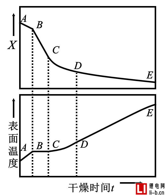 水分的內(nèi)部擴(kuò)散和表面汽化是同時進(jìn)行的,但在干燥過程的不同階段其速率不同,從而控制干燥速率的機(jī)理也不相同。干燥過程分為預(yù)熱升溫段AB、恒速干燥段BC和降速干燥段CDE。
