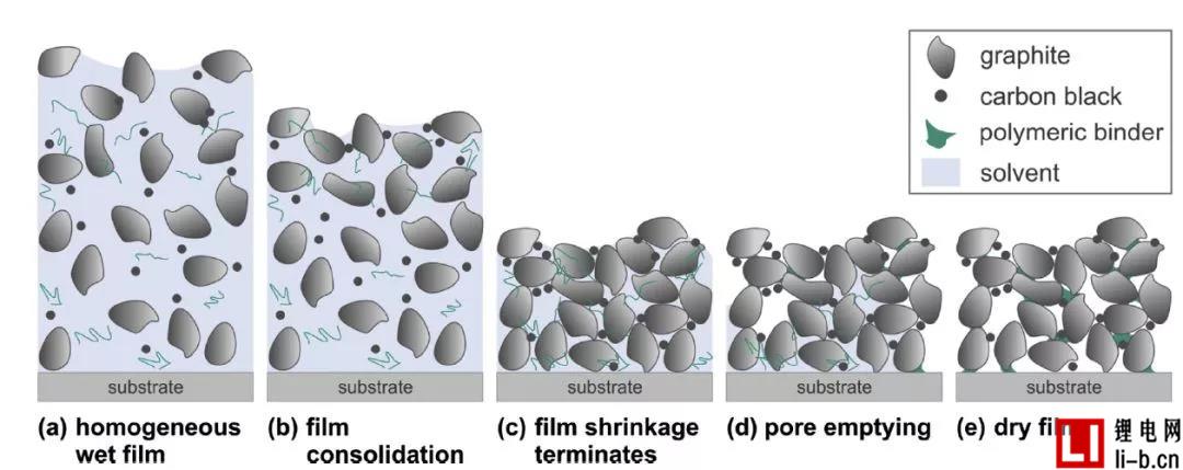 中國粉體網(wǎng)訊 鋰電池電極是一種顆粒組成的涂層,電極制備過程中,均勻的濕漿料涂敷在金屬集流體上,然后通過干燥去除濕涂層中的溶劑。電極漿料往往需要加入聚合物粘結(jié)劑或者分散劑,以及炭黑等導(dǎo)電劑。盡管固含量一般大于30%,但是干燥過程中,溶劑蒸發(fā)時,涂層總會經(jīng)歷一定的收縮,固體物質(zhì)在濕涂層中彼此接近,最后形成多孔的干燥電極結(jié)構(gòu)。