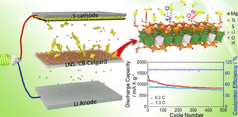最近,中國科學院蘭州化學物理研究所研究員張俊平團隊首次報道了一種黏土礦物超親電解液鋰電池隔膜。鋰皂石含有豐富的O活性位點和Li+,還具有獨特的片層結(jié)構(gòu)和較大比表面。鋰皂石首次被應(yīng)用到鋰硫電池中,用于抑制聚硫化物穿梭,并提高隔膜的Li+電導率。