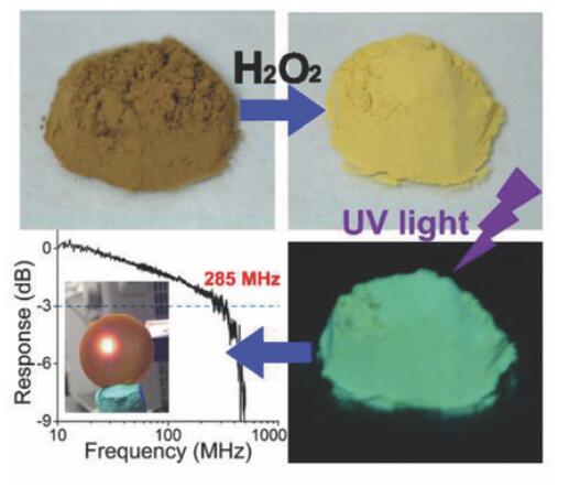 曲松楠課題組利用過氧化氫溶液對以檸檬酸與尿素為原材料,微波法合成的原本固態(tài)熒光猝滅的碳納米點進行氧化處理,該方法不同于被較多報道的將碳納米點摻雜進入例如PVA或無機鹽等基質(zhì)的方法,處理后的碳點獲得寬帶隙的表面能級結(jié)構(gòu),抑制了碳納米點聚集態(tài)下表面態(tài)的無輻射躍遷過程,獲得固態(tài)下熒光量子效率25%的黃綠光碳納米點。以所研制的碳納米點熒光粉作為顏色轉(zhuǎn)換層,通過調(diào)節(jié)碳點熒光粉的比例,制備出不同色溫的白光LEDs。所研制的碳點熒光壽命只有幾個納秒(~ 6ns),將其作為光轉(zhuǎn)換層,制備可見光通信領(lǐng)域器件,國際上首次實現(xiàn)了帶寬為285MHz、信號傳輸速率為435 Mbps的基于碳納米點的可見光通信。